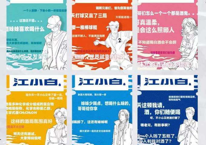 小白,隐喻年轻人。该作品也将江小白的每一瓶根据其色彩,口味及含义设定不同的对应角色。出发点新颖,给人强烈的代入感,角色性格特征鲜明,饱满,通过互动话语让人产生联想。细品其代表口味,让酒变得,有“画”可读。