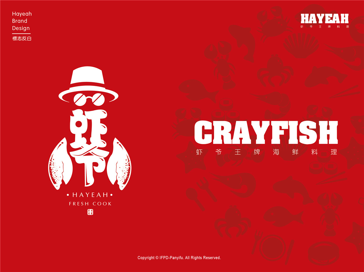 汉字部分做了连接字体连接,虾字底部与爷字上部两笔相连,,下方一撇一捺仿佛是双刀兵器,一气贯通。两个大鳌作为小龙虾的特色形象分在左右,使得标志整体更加稳重大气。英文与印章置于底部使得标志更加整体有连贯性。英文为其命名“HAYEAH”,翻译为哈耶,即是中文“虾爷”音译,又代表食客们食用后的喜悦心情。好了,话不多说,让爷燃暴你的味蕾!!!