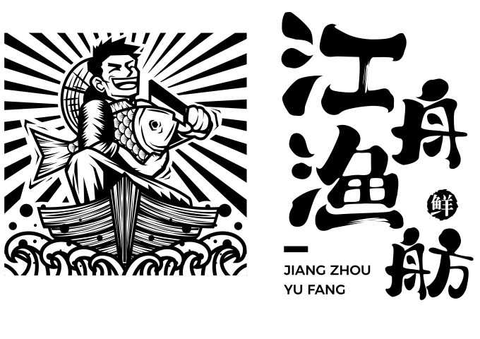 设计诠释: 以渔夫为原型,将形象漫画风结合版画风,漫画的集中线将视觉紧扣在人物和鱼身上,是开心又激动的氛围, 半蹲在船头即将鲜活宰杀的画面,渔船乘风破浪直送眼前,新鲜、绿色、健康、美味、地道!层次鲜明,直观。