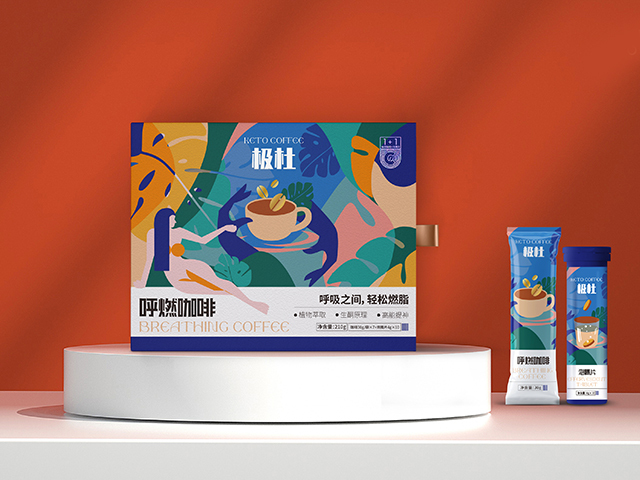 创意来源于植物萃取的原理,画面流动感较强的元素与植物的结合表现健康减肥的属性。版面选用当下流行的扁平插画风格,撞色的搭配强烈的视觉冲击,吸引消费者目光。英文的字体使用偏流动型的衬线字体,主要体现咖啡的流动性。女性指向咖啡的结构设计主要为表现咖啡带来曼妙身材。 整体包装使用局部符号镭射工艺,咖啡豆烫金,主题激凸,整体风格高端时尚。