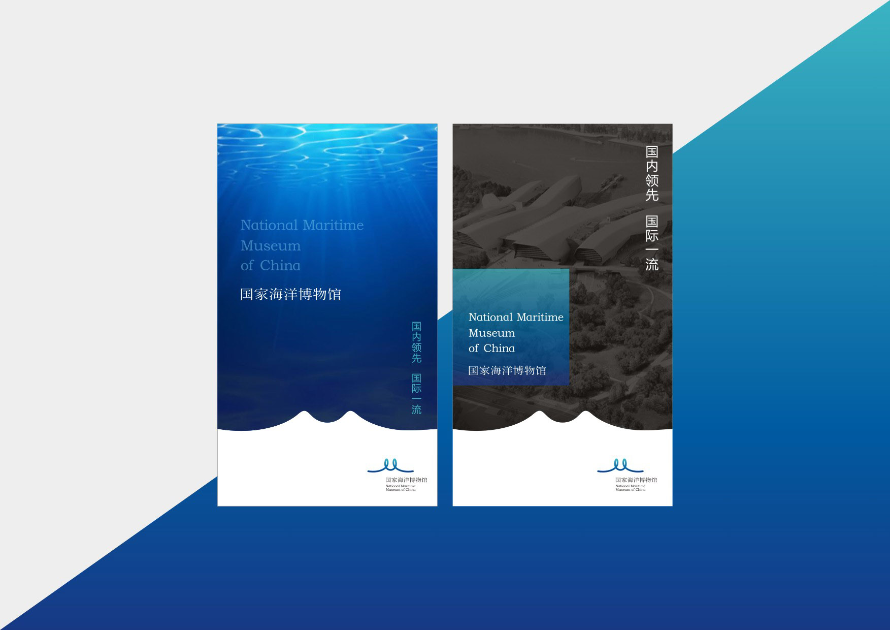 标志以字母NMMC元素提炼,一气呵成,整体造型与海洋博物馆“海天相接、鱼跃海面”的建筑体系和地域特征吻合;